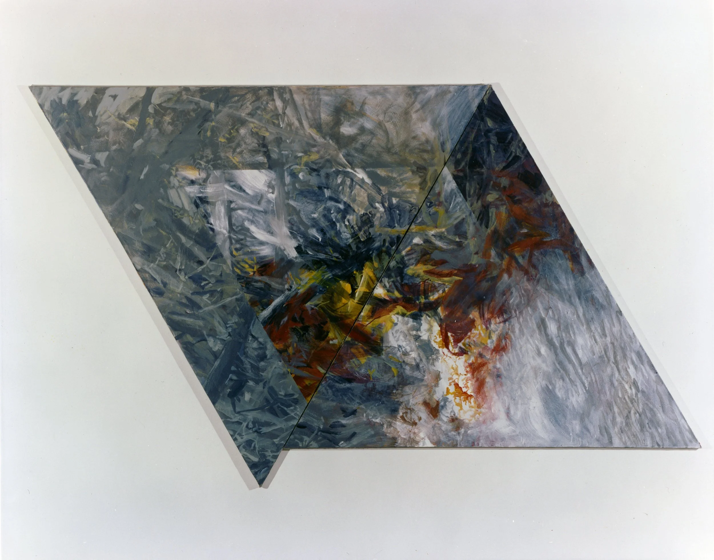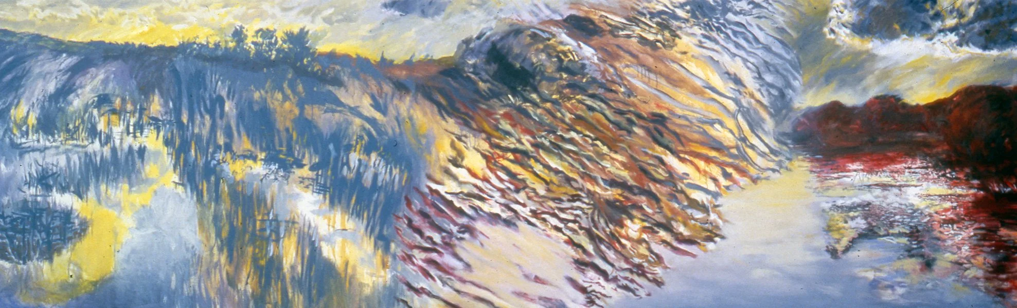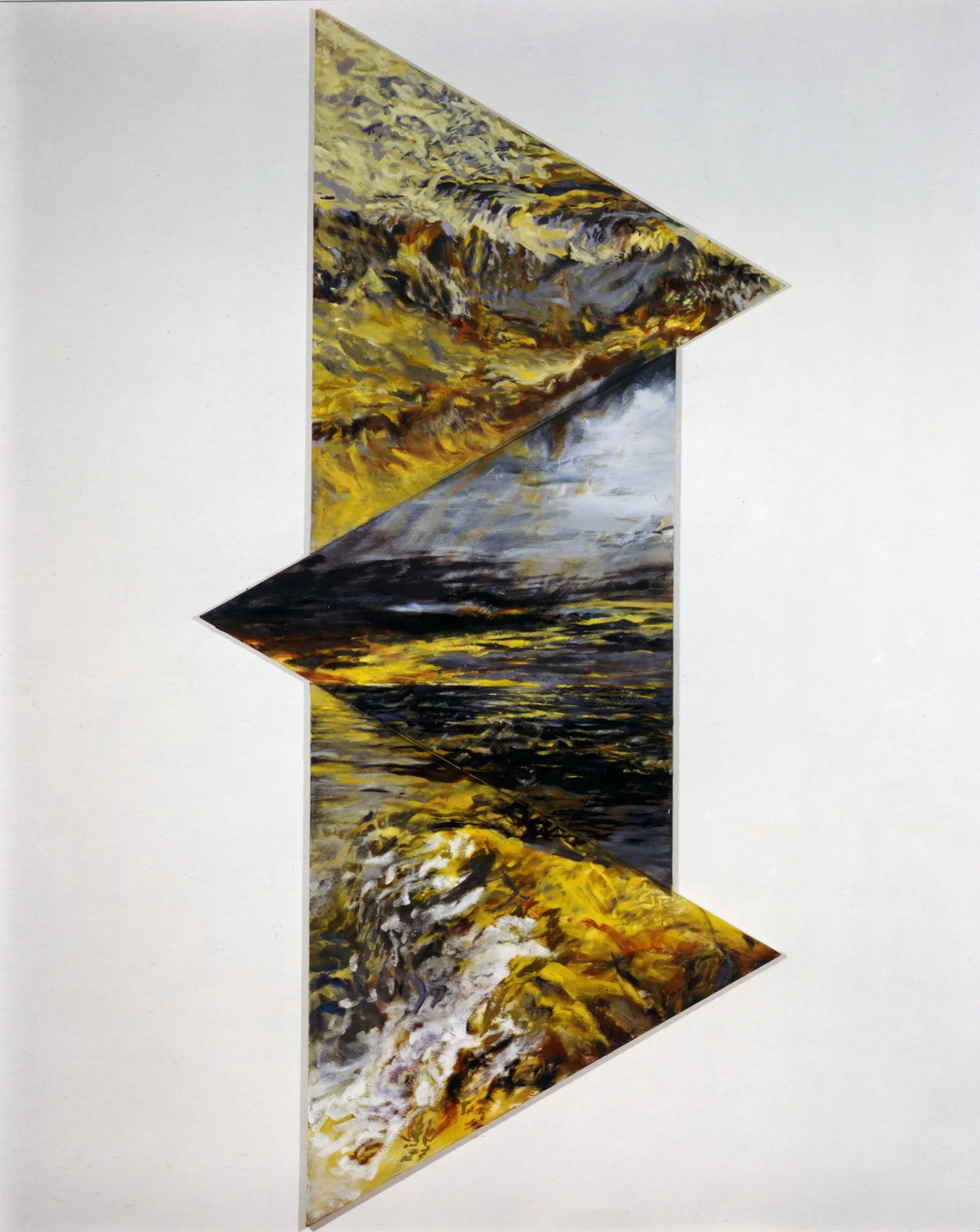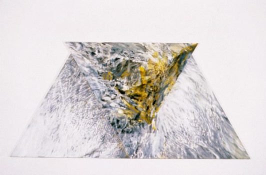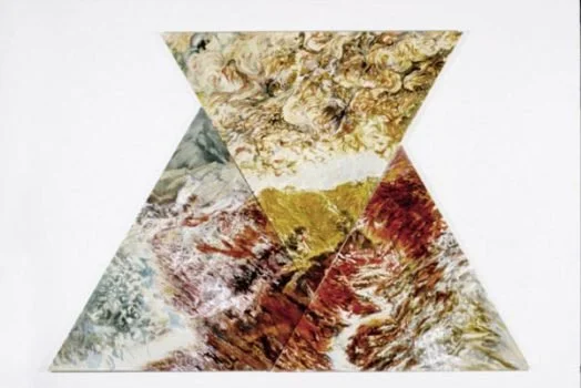 Featured above is work from her series Wild Signs and Take Only Pictures. Wild Signs uses triangular stretchers to represent triangular shapes in nature such as mountains and valleys. The morphing of her triangles through her painting aims to represent the arbitrary ways in which humans designate and carve up wilderness without respect for the dynamics of ecosystems. Take Only Pictures is a series of 16-18 foot panoramic paintings, and was influenced by Le Corbusier’s description of the long horizontal window that simultaneously gives and denies the viewer access to nature. The long horizontal window opens the viewer broadly to the landscape while affording no place for their feet, allowing them to experience the paradox of wilderness in America – humans can designate wilderness areas and experience their power, but they cannot be a part of it.